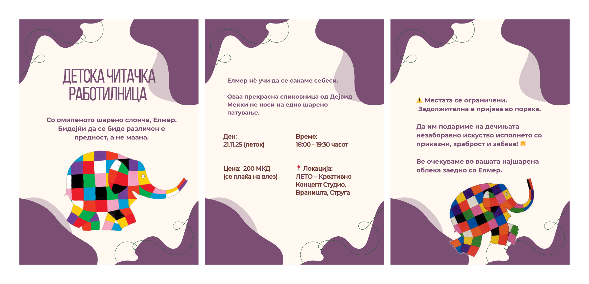 На оваа работилница ќе се запознаеме со шареното слонче, Елмер. Елмер ќе нѐ научи многу за различностите и за прифаќањето себеси. Бидејќи да се биде различен е предност, а не маана. Задолжителна е пријава на формата, местата се многу ограничени!