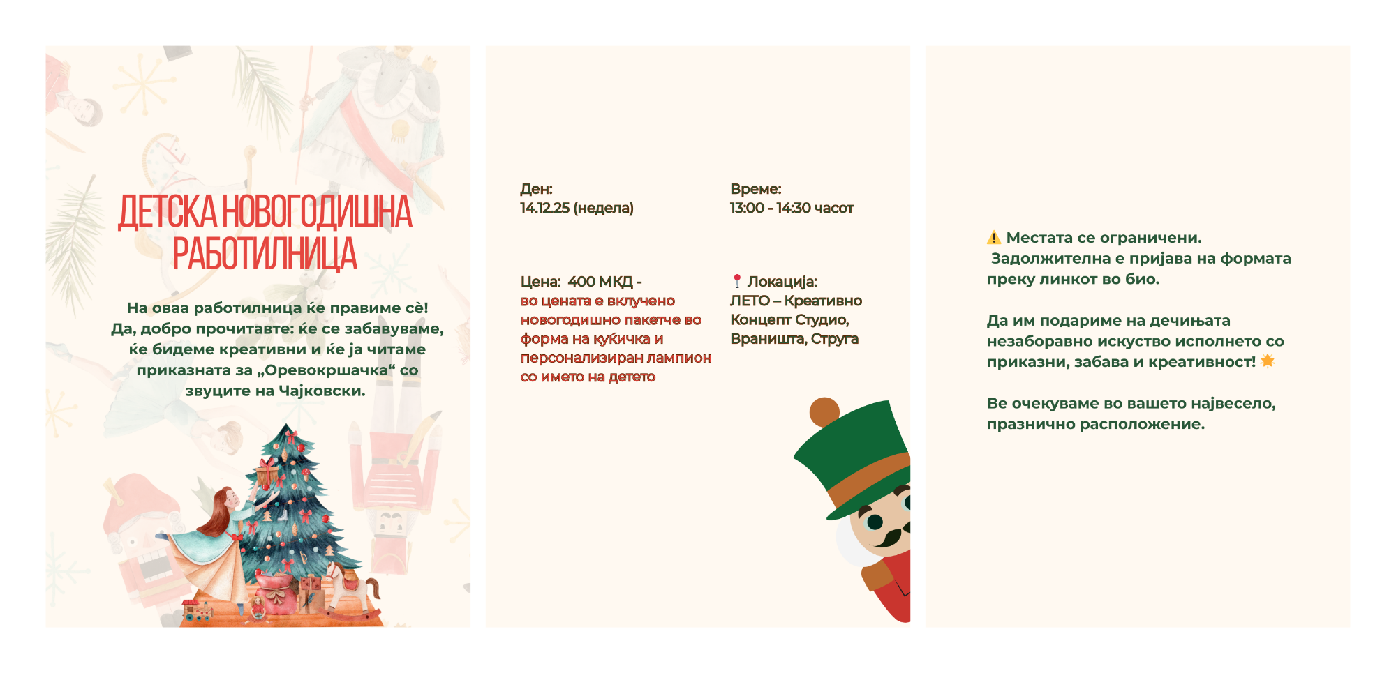 На оваа детска креативна работилница ќе правиме сѐ! Да, да, добро прочитавте: ќе ја читаме приказната за „Оревокршачка“ со звуците на Чајковски, ќе изработиме нешто креативно, ќе научиме нешто ново, ќе се забавуваме и ќе се дружиме. Задолжителна е пријава на формата, местата се многу ограничени!